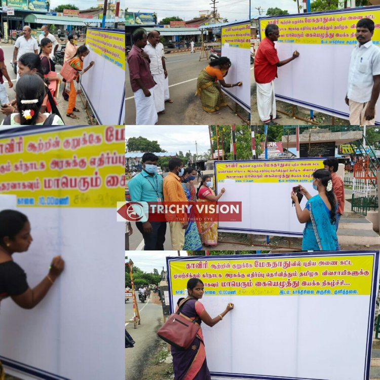 காவிரியின் குறுக்கே மேகதாதுவில் அணை கட்ட கர்நாடக அரசு தொடர்ந்து தீவிரம் காட்டி வருகிறது. இதற்கு கர்நாடக அரசை கண்டித்தும் அணைக்கட்டு எந்த விதமான அனுமதி வழங்கக் கூடாது என்று வலியுறுத்தி மாபெரும் கையெழுத்து இயக்க நிகழ்ச்சி குளித்தலை காவிரி பாசன விவசாயிகள், சமூக ஆர்வலர்கள், பொதுநல அமைப்புகள் சார்பாக குளித்தலை பேருந்து நிலையத்தில் கையெழுத்து பெறும் நிகழ்ச்சி நடைபெற்றது.