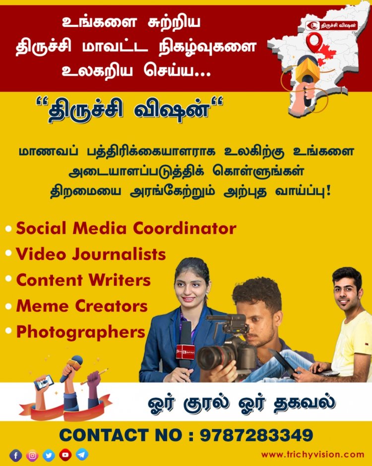 உங்களைச் சுற்றி திருச்சி மாவட்ட நிகழ்வுகளை உலகறியச் செய்ய திருச்சி மாணவ பத்திரிக்கையாளராக உலகிற்கு உங்களை அடையாளப்படுத்திக் கொள்ள உங்கள் திறமைகளை வெளிப்படுத்த அரிய வாய்ப்பை வழங்குகிறது உங்கள் திருச்சி விஷன்.