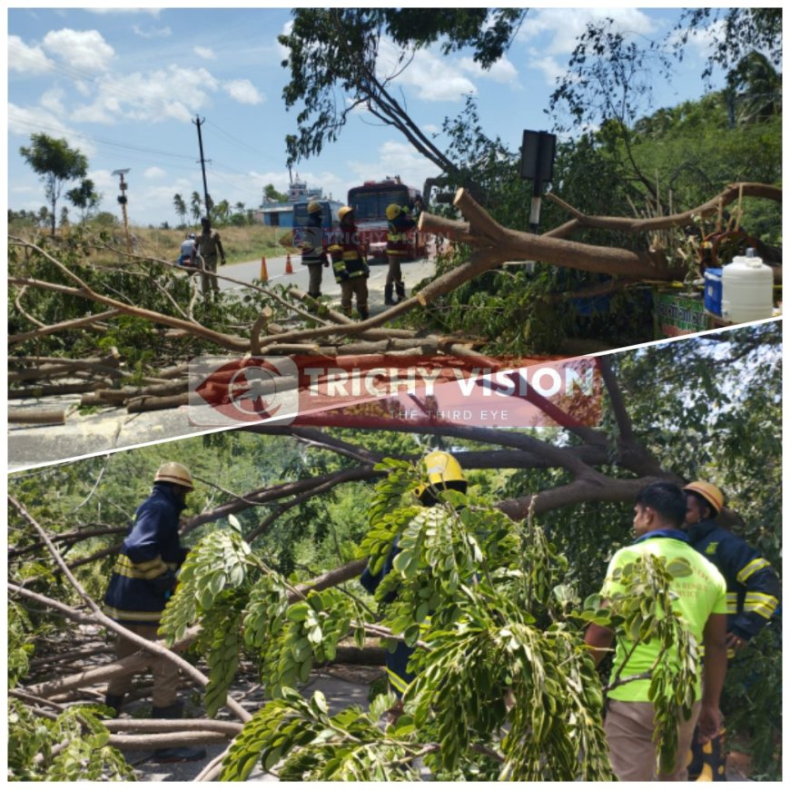 திருச்சியில் வெயில் தாக்கம் உள்ள நிலையில் இன்று மதியம் பலத்த காற்று வீசியது. இதனால் திருச்சி – கரூர் தேசிய நெடுஞ்சாலையில் வெள்ளந்துரைக்கும், முருகன் பேட்டைக்கும் இடையில் உள்ள சாலை ஓரத்தில் இருந்த பெரிய மரமானது சாய்ந்து ரோட்டின் குறுக்கே விழுந்தது.