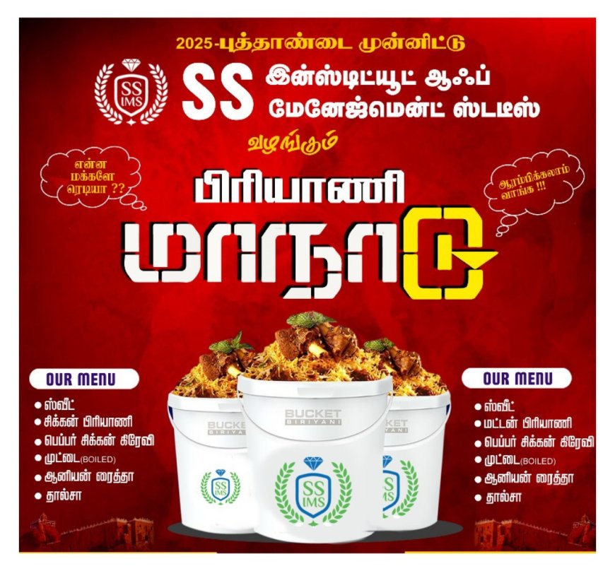 அன்பிற்குரியவர்களுக்கு வணக்கம். புத்தாண்டு நல்வாழ்த்துக்கள்! நம் திருச்சி SS இன்ஸ்டிட்யூட் ஆஃப் மேனேஜ்மென்ட் ஸ்டடிஸ் சார்பில், புத்தாண்டு சிறப்பினை கொண்டாட சிக்கன் பிரியாணி மற்றும் மட்டன் பிரியாணி ஃப்ரீ புக்கிங் ஆர்டர் நடைபெற்று வருகிறது.