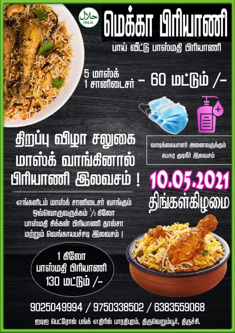 அந்தவகையில் திருச்சி திருவெறும்பூரில் புதியதாக தடம் பதிக்க உள்ள MECCA BRIYANI(Halal) (பாய் வீட்டு பாஸ்மதி பிரியாணி) யின் துவக்க விழா சலுகையாக மாஸ்க் மற்றும் சானிடைசர் வாங்கினால் 1/2 சிக்கன் பிரியாணி + தால்சா + Onion Raitha இலவசம் என அறிவித்துள்ளனர்.