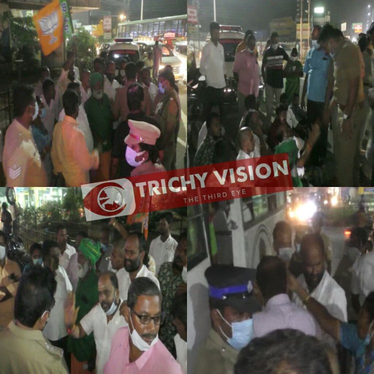 தஞ்சாவூரில் விஷ்வ இந்து பரிஷத் மாநில அமைப்பு செயலாளர் சேதுராமன் கைது செய்யப்பட்டதை கண்டித்தும், திருக்காட்டுப்பள்ளியில் மதமாற்றம் செய்யப்பட்ட சிறுமி இறந்ததற்கு கண்டனம் தெரிவித்து திருக்காட்டுப்பள்ளியில் , திருச்சி அரியமங்கலம் பால்பண்ணையில், பாஜக சார்பில் சாலை மறியல் போராட்டம்.