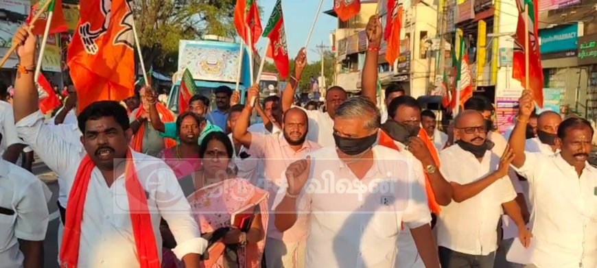 பா.ஜக மாநில பொதுச் செயலாளர் கருப்பு முருகானந்தம் தலைமையில் லால்குடி சாலையில் திரண்ட பா.ஜ.கவினர் கண்டன கோஷங்களை எழுப்பியவாறு ஊர்வலமாக சென்றனர்.தொடர்ந்து நம்பர் ஒன் டோல்கேட் ரவுண்டானா அருகே அமைந்துள்ள அரசு டாஸ்மாக் கடையை முற்றுகையிட முயன்றபோது போலீசார் தடுத்து நிறுத்த முயன்றனர்.