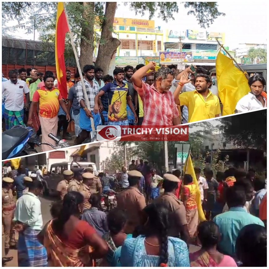 இதுகுறித்து தகவல் அறிந்த போலீசார் அவர்களிடம் சமரச பேச்சுவார்த்தையில் ஈடுபட்டனர். இதனையடுத்து போராட்டத்தில் ஈடுபட்டவர்கள் சுமார் ஒரு கிலோ மீட்டர் தூரத்திற்கு காட்டுப்புத்தூர் காவல் நிலையம் வரை நடந்து சென்று அங்கிருந்த காவல் ஆய்வாளர் முத்தையனிடம் புகார் மனு அளித்தனர். புகார் மீது உரிய விசாரணை நடத்தி சம்பந்தப்பட்ட நபர்கள் மீது சட்ட ரீதியான நடவடிக்கை எடுக்கப்படும் என போலீசார் உறுதியளித்தனர்.