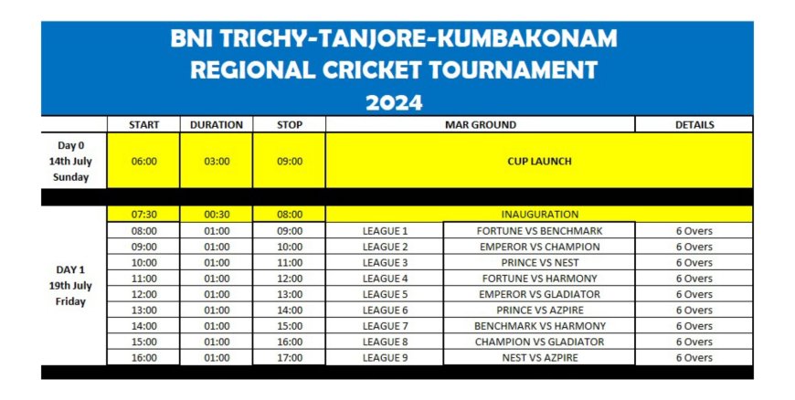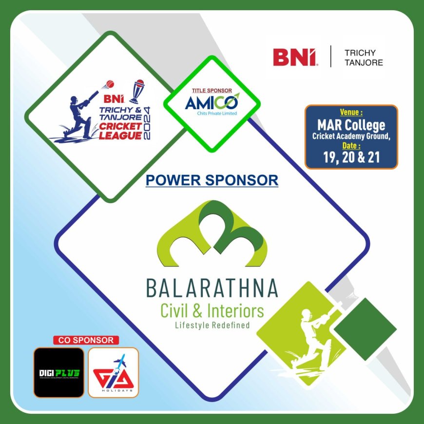 BNI Trichy Tanjore சார்பில் மாபெரும் கிரிக்கெட் போட்டி வருகிற 19, 20 மற்றும் 21, மூன்று தேதிகளில் திருச்சி அருகே உள்ள எம் ஏ ஆர் கல்லூரி மைதானத்தில் நடைபெற உள்ளது.