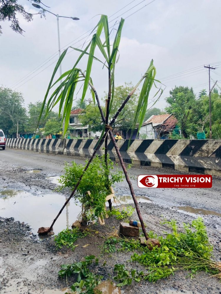 இந்நிலையில் திருச்சி ராம்ஜி நகர் பகுதியில் திருச்சி – திண்டுக்கல் தேசிய நெடுஞ்சாலை குண்டும் குழியுமாக பழுதடைந்துள்ளது. இந்நிலையில் அப்பகுதி இளைஞர்கள் நடுரோட்டில் கரும்பு வைத்து வாகன ஓட்டிகளுக்கு எச்சரிக்கை விடுத்து வருகின்றனர்.