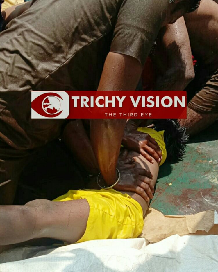 சமயபுரம் நால்ரோடு அருகே சமயபுரம் மாரியம்மன் கோயிலின் தெப்பக்குளம் உள்ளது. இந்த தெப்ப குளத்திலிருந்து சமயபுரம் மாரியம்மன் கோயிலுக்கு நேர்த்தி கடனாக பக்தர்கள் பால்குடம், அலகு குத்துதல், தீ சட்டி எடுத்தல் போன்றவைகளை எடுத்துச் சென்றனர். இதனை தெப்பகுளம் அருகே நின்று வேடிக்கை பார்த்துக் கொண்டிருந்த முத்தையன் மகன் 10 வயதான பெரியசாமி என்ற சிறுவன், தெப்பக் குளத்தில் தவறி விழுந்து நீரில் மூழ்கினார்.