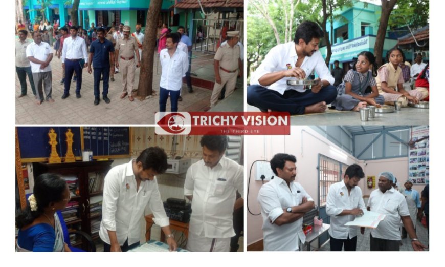 திருச்சிக்கு வருகை தந்துள்ள விளையாட்டுத்துறை அமைச்சர் உதயநிதி ஸ்டாலின் திருச்சி மரக்கடை பகுதியில் அமைந்துள்ள சையது முர்துசா மேல்நிலைப் பள்ளியில் திடீர் ஆய்வு மேற்கொண்டார்.