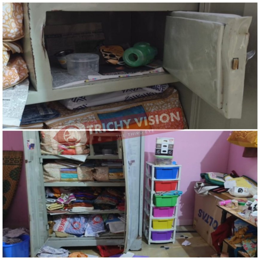 திருச்சி மாவட்டம் மண்ணச்சநல்லூரை அடுத்த நம்பர் ஒன் டோல்கேட் பகுதியில் உள்ள ஆர்.கே.வி நகரை சேர்ந்தவர் தேவதாஸ் (60). மேலும் இவரது மனைவி ஆனந்தகுமாரி இவர் முசிறி மின்சார வாரியத்தில் ஏடி யாக பணிபுரிந்து வருகிறார். இந்நிலையில் கடந்த ஜூலை 12ம் தேதி இவர்களின் உறவினரின் வீட்டின் துக்க நிகழ்ச்சிக்காக வீட்டை பூட்டிவிட்டு பெங்களூருக்கு சென்றுள்ளார்.