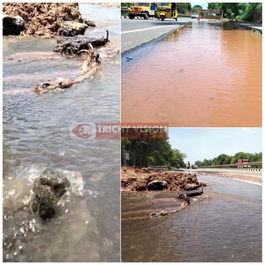 திருச்சி தேசிய நெடுஞ்சாலையில் உடைந்த குடிநீர் குழாய் – லட்சகணக்கான லிட்டர் குடிநீர் வீண்