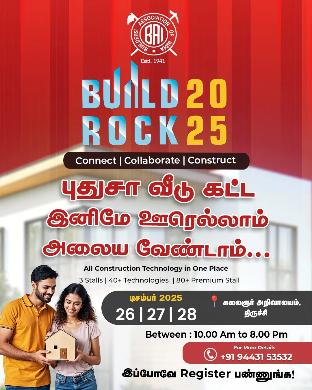 பில்டர்ஸ் அசோசியேஷன் ஆஃப் இந்தியா (BAI) திருச்சிராப்பள்ளி மையம் சார்பில் “பில்ட் ராக் 2025” என்ற கட்டிடத் துறை கண்காட்சி, டிசம்பர் 26, 27, 28 ஆகிய தேதிகளில் திருச்சியில் நடைபெற உள்ளது.