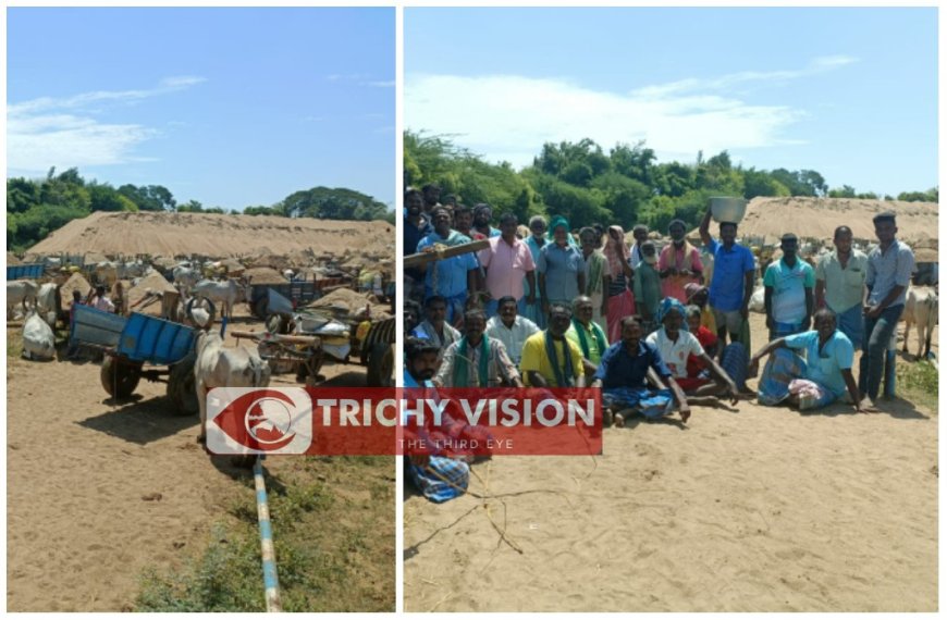 இந்த மணல் குவாரியில் மணல்களை கொள்முதல் செய்ய தினசரி காலை 7:00 மணி முதல் செயல்படுவது வழக்கம். ஆனால் இன்று மணல் குவாரியில் செயல்படும் அலுவலர்கள் திடீரென்று இன்று காலை மணலை கொள்முதல் செய்ய அனுமதி சீட்டு வழங்க மறுத்ததுடன் இனிவரும் காலங்களில் தினசரி காலை 10 மணி முதல் மணல் குவாரி செயல்படும் என அறிவித்ததால் 100க்கும் மேற்பட்ட மாட்டு வண்டி மணல் தொழிலாளர்கள் மணல் குவாரியிலேயே உள்ளிருப்பு போராட்டத்தில் ஈடுபட்டனர் .