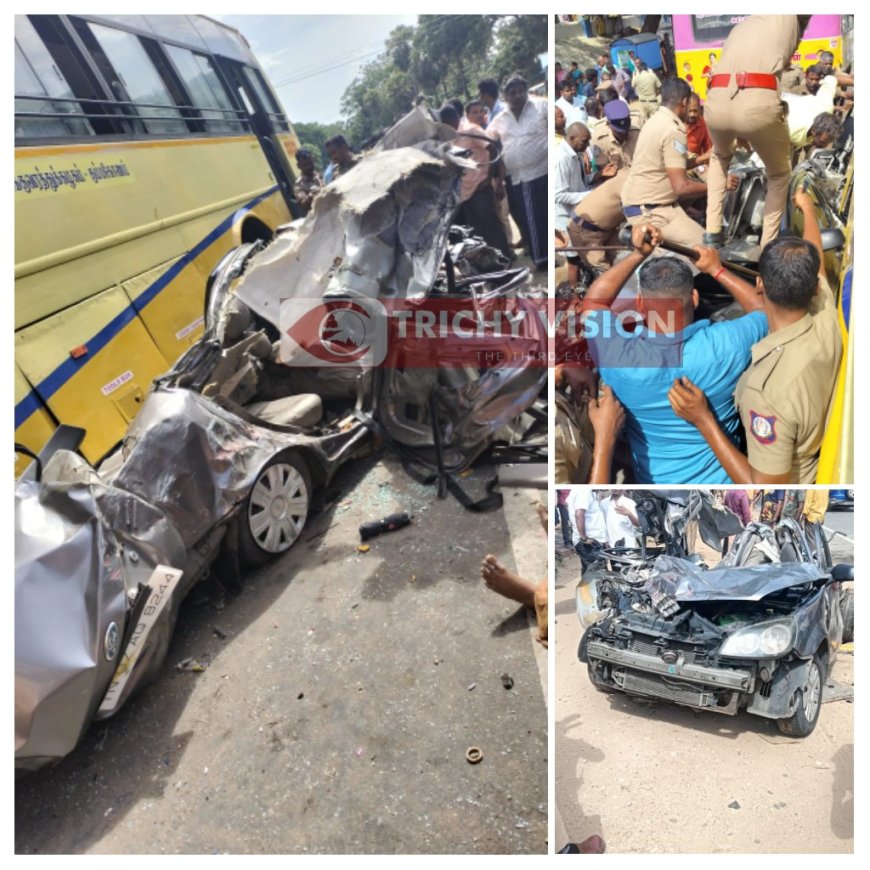 திருச்சி முக்கொம்பு பேருந்து நிறுத்தம் அருகே நகரப் பேருந்து ஒன்று பயணிகளை இறக்கிவிட நின்றது. பின்னால் கோயம்புத்தூரில் இருந்து திருச்சி நோக்கி வந்த கார் வேகமாக வந்து தடுமாறி பிரேக் அடித்த பொழுது பின்பு வந்த அரசு பேருந்து கார் மீது ஏறி இறங்கி உள்ளது. காரில் பயணம் செய்த மூவர் படுகாயம் அடைந்தனர்.