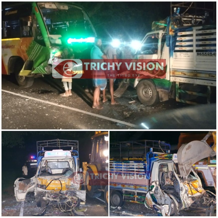 திருச்சி மாவட்டம் வாத்தலை அருகே தனியார் பேருந்தும், மினி லாரியும் நேருக்கு நேர் மோதி விபத்துக்குள்ளானது. இதில் மினி லாரி டிரைவர் அய்யம்பாளையம் பாரதிநகரை சேர்ந்த மதிவாணன் (34) சம்பவ இடத்திலேயே பலியானார்.