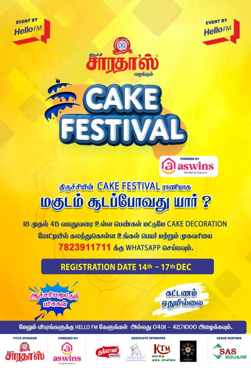புத்தாண்டு மற்றும் கிறிஸ்துமஸ் பண்டிகையை முன்னிட்டு திருச்சி சாரதாஸ் வழங்கும் ஹலோ எப்.எம். நடத்தும் கேக் பெஃஸ்டிவல்”. நடைபெற உள்ளது. 18 முதல் 45 வயதுக்கு உட்பட்ட மகளிர் மட்டும் பங்குபெறக்கூடிய வகையில் இப்போட்டி வடிவமைக்கப்பட்டுள்ளது.