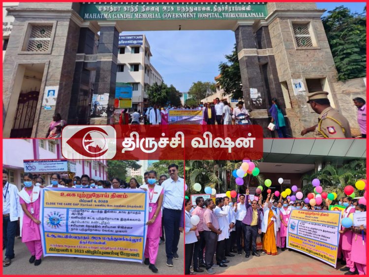 திருச்சி கி.ஆ.பெ விஸ்வநாதன் மருத்துவக் கல்லூரி மருத்துவமனையில் முதல்வர் நேரு தலைமையில் மருத்துவர்கள் செவிலியர்கள் மருத்துவ மாணவர்கள் புற்றுநோய்க்கு எதிரான விழிப்புணர்வு பேரணி நடத்தினர்.
