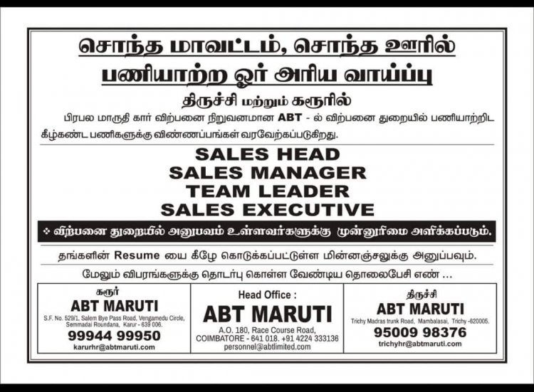 மாருதி கார் விற்பனை நிறுவனமான ABT- ல் விற்பனை துறையில் காலி பணியிடங்கள் இருக்கின்றன.