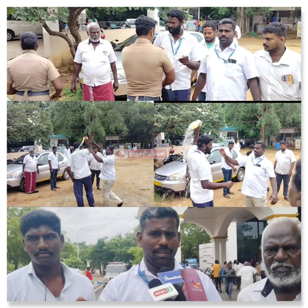 மொத்தம் 50க்கும் மேற்பட்ட வாடகை கார்கள் இயங்கி வந்த நிலையில் ஒரு சிலர் அந்த தனியார் நிறுவனம் கேட்ட முன் பணத்தை செலுத்தி விட்டதாகவும், 13 நபர்கள் அந்த முன்பணத்தை செலுத்த முன் வராததால் அவர்களை விமான நிலையத்திற்குள் அனுமதிக்க மறுப்பதாகவும் கூறி இன்று திருச்சி மாவட்ட ஆட்சியர் அலுவலகத்தில் நடைபெற்ற மனுநீதி நாள் முகாமில் தலைவர் சிவா தலைமையில் ஓட்டுநர்கள் மனு வழங்க வந்தனர் அப்போது செயலாளர் ராஜேந்திரன் தனது உடலில் பெட்ரோலை ஊற்றி தீக்குளிக்க முயன்றனர்.