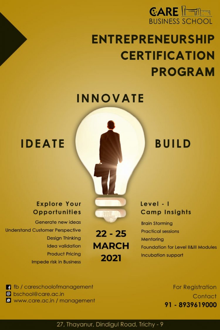இந்த ஐயத்தினை போக்கும் பொருட்டு கேர் பிசினஸ் ஸ்கூல்(Care business school ) தொழில்முனைவோருக்கான 4 நாள் பயிலரங்கம் மார்ச் 22முதல் 25 வரை நடத்த உள்ளனர்.