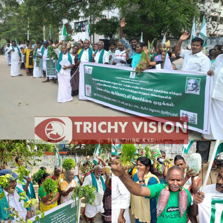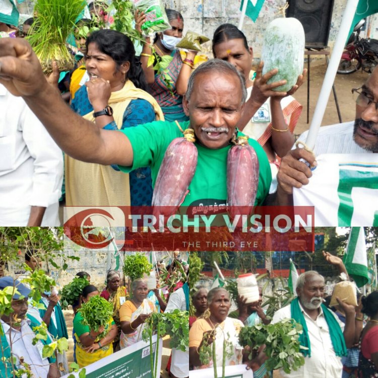 விளைபொருட்களை கையில் ஏந்தியும், மாலையாக அணிந்து விவசாயிகள் மேகதாதுவில் அணைக்கட்டும் கர்நாடக அரசு உடனடியாக அதனை நிறுத்த வேண்டும், திருச்சி உய்யக்கொண்டான் வாய்க்கால், அரியாறு, கோறையாற்றில் நிரந்தர வெள்ள தடுப்பு நடவடிக்கைகளை மேற்கொள்ள வேண்டும் உள்ளிட்ட கோரிக்கைகளை வலியுறுத்தி தமிழக விவசாயிகள் சங்கம் சார்பில் திருச்சி மாவட்ட ஆட்சியர் அலுவலகம் முன்பு அதன் மாவட்ட தலைவர் ம.ப சின்னதுரை தலைமையில் காய்கறிகள், நெல், பயிறு போன்ற தானியங்கள், பூ செடிகள் உள்ளிட்ட விவசாய பொருட்களுடன் 50க்கும் மேற்பட்ட விவசாயிகள் கண்டன ஆர்ப்பாட்டத்தில் ஈடுபட்டனர்.