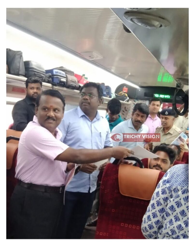 திருநெல்வேலியில் இருந்து காலை 6:00 மணிக்கு புறப்பட்ட வந்தேபாரத் அதிவேக விரைவு ரயில் சரியாக 9:40க்கு திருச்சி ஜங்ஷன் முதல் நடைமேடைக்கு வந்து சேர்ந்தது. இந்த ரயிலில் பயணம் செய்யக்கூடிய பயணிகளுக்கு திருச்சி ரயில்வே கோட்ட மேலாளர் அன்பழகன், ரயில்வே வணிக கோட்ட மேலாளர் செந்தில்குமார் உள்ளிட்ட ரயில்வே அதிகாரிகள் ரயில் பயணத்தின் போது பின்பற்ற வேண்டிய விதிமுறைகள் அச்சிடப்பட்ட துண்டு பிரசுரங்கள் வழங்கி விழிப்புணர்வு ஏற்படுத்தினார்கள்.