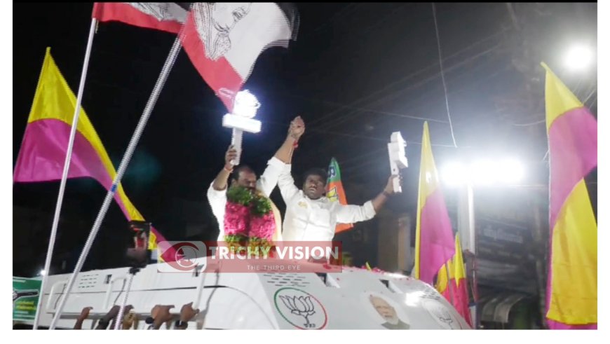 தேசிய ஜனநாயக கூட்டணியில் அம்மா மக்கள் முன்னேற்ற கழகம் சார்பாக செந்தில்நாதன் போட்டியிடுகிறார். அவரை ஆதரித்து பாஜக மாநில தலைவர் அண்ணாமலை நேற்று தேர்தல் பிரச்சாரம் மேற்கொண்டார். 7 மணிக்கு தென்னூர் பகுதியில் பிரச்சாரம் மேற்கொள்வார் என அறிவிக்கப்பட்டிருந்தது. ஆனால் அவர் 10:10 மணிக்கு தான் அந்த பகுதிக்கு வந்தடைந்தார்.