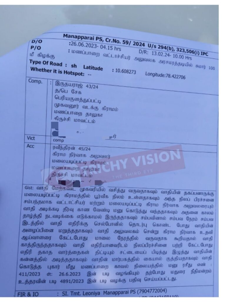 இதுதொடர்பாக (26.06.2023)-ம் தேதி மணப்பாறை வட்டாட்சியர் அலுவலகத்தில் இருந்த விஏஓ ரவீந்திரனை நேரில் சந்திக்க சென்றார். அப்போது, அலுவலகத்தில் இருந்து வெளியே வந்த விஏஓ இருதயராஜ், அங்கு நின்று கொண்டிருந்த இருதயராஜூவை தகாத வார்த்தைகளால் திட்டி தாக்கியதாக கூறப்படுகிறது. இதில் காயமடைந்த இருதயராஜ், மணப்பாறை அரசு மருத்துவமனையில் சிகிச்சை பெற்று சில தினங்களில் வீடு திரும்பினார்.
