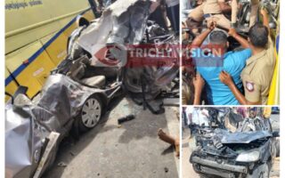 திருச்சி அருகே கார் மீது ஏறி இறங்கிய பேருந்து…