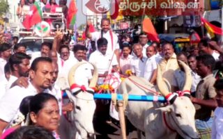 மாட்டுவண்டியில் வந்து வாக்கு சேகரித்த அதிமுக வேட்பாளர்