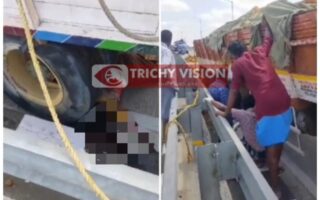லாரி டயர் வெடித்ததில் பின்பக்க சக்கரத்தில் சிக்கி ஓட்டுநர்…
