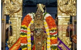 மாந்துளிர் நிற பட்டு அணிந்து சௌரிக் கொண்டையுடன் நம்பெருமாள்