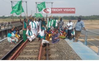 திருச்சியில் தண்டவாளத்தில் அமர்ந்து விவசாயிகள் ரயில் மறியல் போராட்டம்