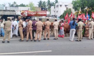 பாதை ஆக்கிரமிப்பு – பசு மாடுகளுடன் சாலை மறியல்