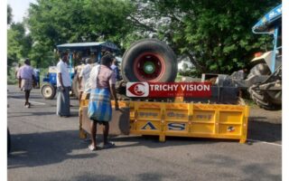 சாலை நடுவே தலைகீழாக கவிழ்ந்த டிராக்டர் – போக்குவரத்து…
