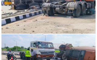 தேசிய நெடுஞ்சாலையில் சிமெண்ட் ஏற்றி சென்ற லாரி கவிழ்ந்து…