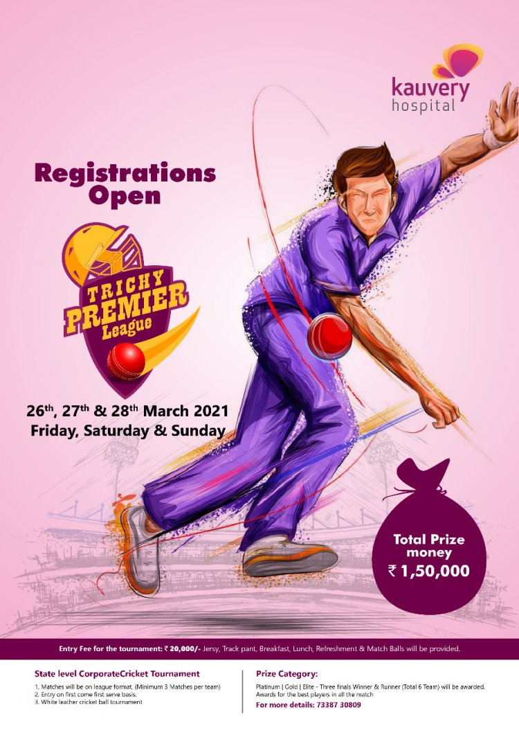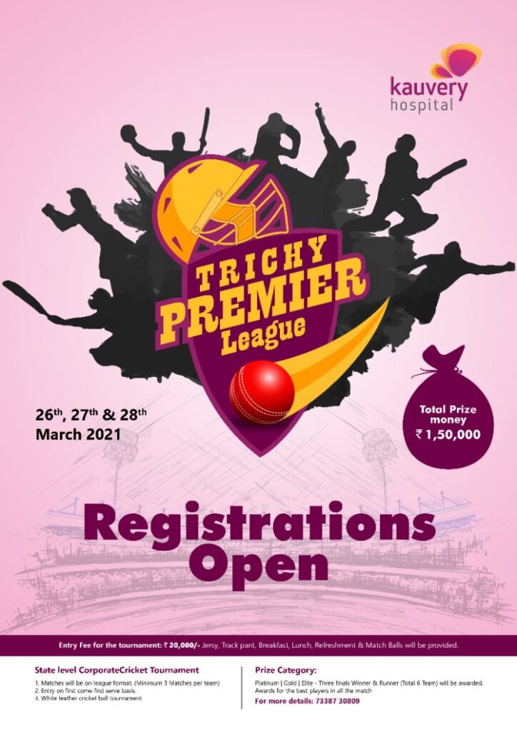 திருச்சி காவேரி மருத்துவமனை சார்பாக திருச்சி பிரீமியர் லீக் கிரிக்கெட் போட்டிகள் வருகிற 26-ஆம் தேதி முதல் துவங்குகிறது. இப்போட்டிகள் 26,27, 28 ஆகிய மூன்று தினங்கள் நடைபெற உள்ளது. இப்போட்டியில் பங்கேற்கும் அணி தொடர்நுழைவு கட்டணமாக 20000 ரூபாய் செலுத்தி முன்பதிவு செய்துகொள்ள வேண்டும். ஒரு அணி 3 போட்டிகளில் விளையாட வேண்டும் .வெள்ளை நிற தோலில்லான கிரிக்கெட் பந்தில் போட்டிகள் நடைபெறும்.