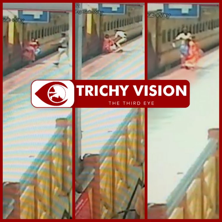 திருச்சி ரயில் நிலையத்தில் ஓடும் ரயிலில் ஏறி தவறி விழுந்த பெண்ணை காப்பாற்றிய ஆர்.பி.எப் காவலர் சிசிடிவி காட்சி