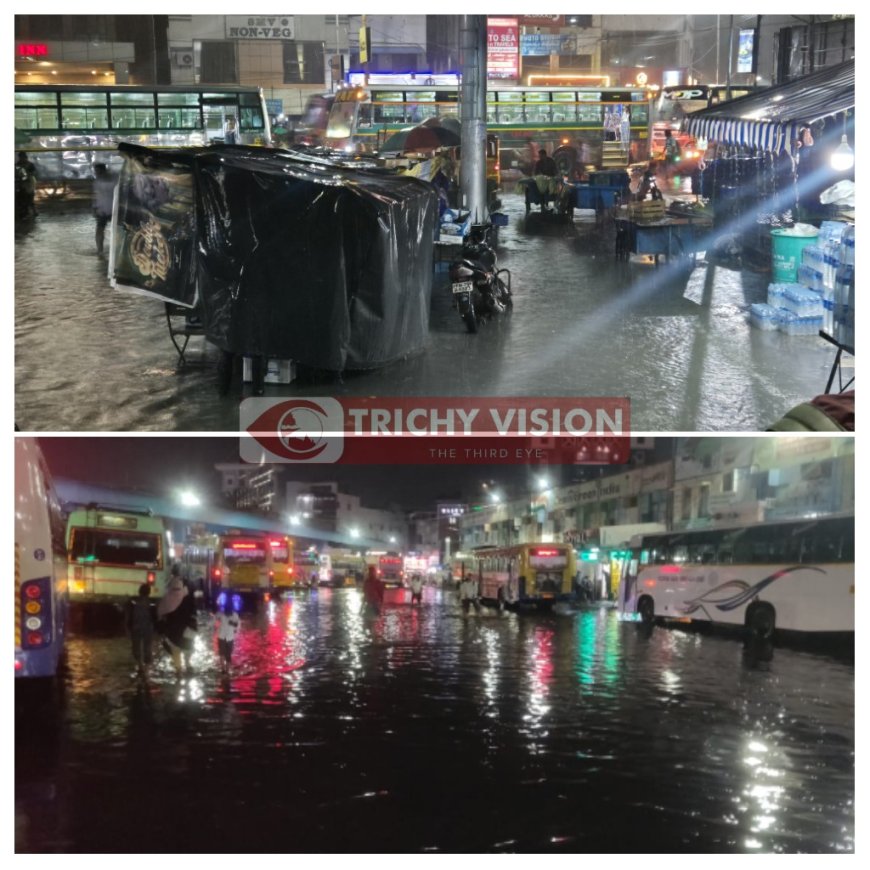 திருச்சி மத்திய பேருந்து நிலையம், தலைமை தபால் நிலையம் கண்டடோன்மெண்ட் உள்ளிட்ட மாநகர பகுதிகளில் கன மழை பெய்ததால் மழை நீர் வெள்ள நீர் போல் ஓடியது.முக்கியமாக திருச்சி மத்திய பேருந்து நிலையம் குளமாக மாறியது.