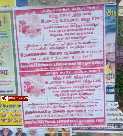 திருச்சி ஸ்ரீரங்கம் ரங்கநாதர் கோவில் இணை ஆணையர் ஜெயராமன் திடீரென இடமாற்றம் செய்யப்பட்டதை கண்டித்து திருச்சியில் பல இடங்களில் போஸ்டர்கள் ஒட்டப்பட்டுள்ளன.