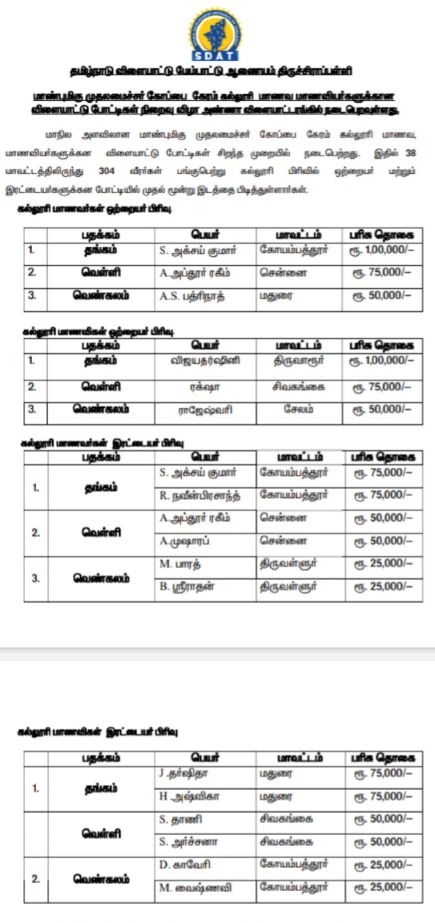 மாவட்ட அளவிலான தனிநபர் போட்டிகளில் முதலிடத்தில் வெற்றி பெற்றவர்கள் / குழு போட்டிகளில் தேர்வு செய்யப்பட்ட வீரர்கள் மற்றும் வீராங்கனைகள் (06.10.2024) முதல் (23.10.2024) வரை அண்ணா விளையாட்டரங்கில் நடைபெறும் மாநில அளவிலான கைப்பந்து மற்றும் கேரம் போட்டிகளில் 38 மாவட்டங்களிலிருந்து விளையாட்டு வீரர் / வீராங்கனைகள் கலந்து கொண்டு நடைபெற்ற விளையாட்டு போட்டிகளில் வெற்றி பெற்றவர்களுக்கு பரிசுகள் மற்றும் பாராட்டுச் சான்றிதழ்கள் வழங்கப்பட்டு வருகிறது.