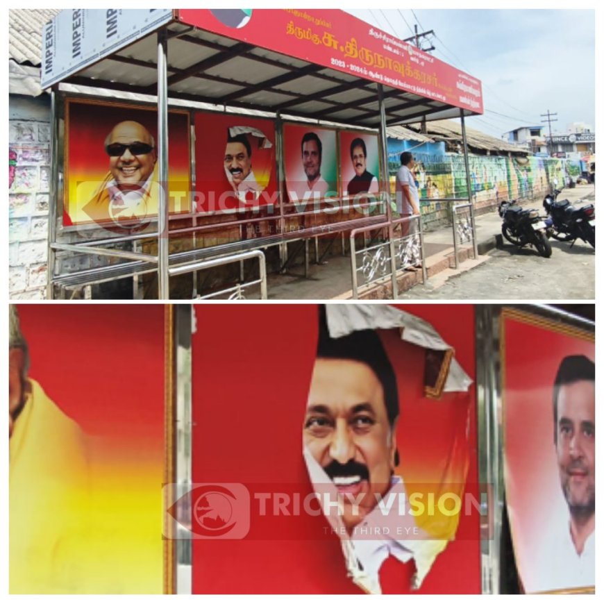 திருச்சி பேருந்து நிறுத்த நிழற்குடையில் முதலமைச்சர் புகைப்படம் கிழிப்பு – காங்கிரசார் புகார்