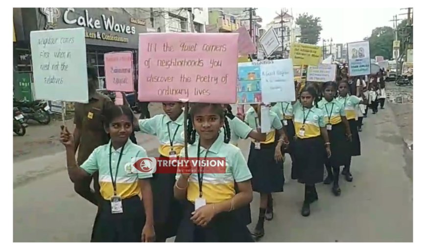 பேரணியில் கலந்து கொண்ட பள்ளி குழந்தைகள் அண்டை வீட்டாருடன் அன்பைக் காப்போம், சிறந்த உறவு என்பது நம்மை சிரிக்க வைப்பது, சுற்றத்தாரே சுகமான சொந்தங்கள், பணம் சேர்ப்பது மிகவும் கடினம் செலவழிப்பது மிகவும் சுலபம், மகிழ்ச்சியின் இருப்பிடம் பாசத்தின் வளர்ப்பிடம், உள்ளிட்ட விழிப்புணர்வு பதாகைகளை கையில் ஏந்தியபடி குழந்தைகள் தினம் குறித்த விழிப்புணர்வு ஏற்படுத்தும் வகையில் ஊர்வலமாகச் சென்றனர்.
