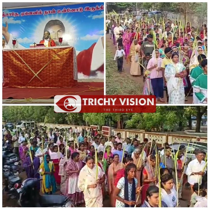 இதனையொட்டி திருச்சி மாநகரில் பிரசித்திபெற்ற பொன்மலை புனித சூசையப்பர் ஆலயத்தில் குருத்தோலை ஏந்தி பவனியாக வந்தனர். இதே போன்று குழந்தை இயேசு திருத்தலத்தில் பங்குத்தந்தை அந்தோணி இருதயராஜ் தலைமையில் அருட்தந்தைகள் விமலன், ஜெயசீலன் ஆகியோர் பங்கேற்று அதிகாலை சிறப்பு திருப்பலியிணை நிகழ்த்தினர்.