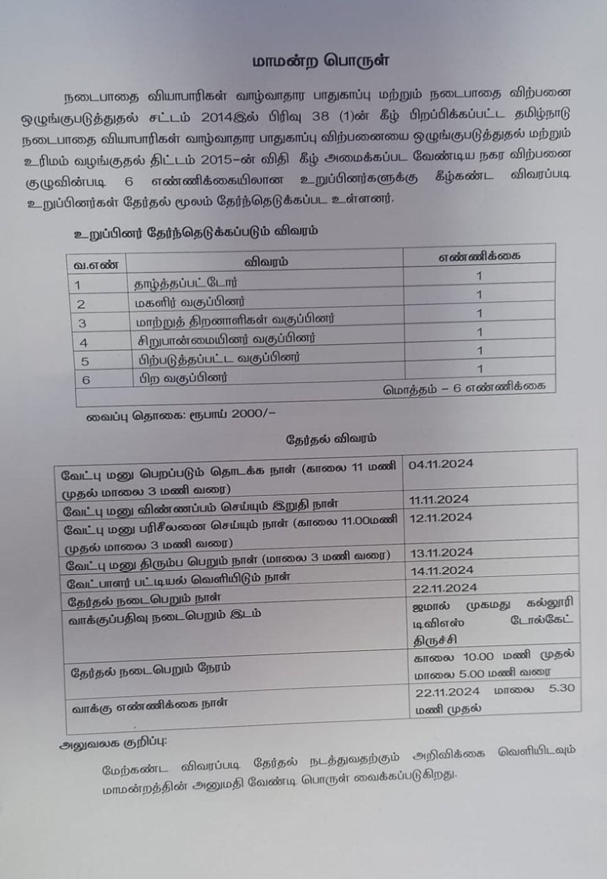 உரிமம் வழங்குதல் திட்டம் 2015-ன் விதி கீழ் அமைக்கப்பட வேண்டிய நகர விற்பனை குழுவின்படி 6 எண்ணிக்கையிலான உறுப்பினர்களுக்கு கீழ்கண்ட விவரப்படி உறுப்பினர்கள் தேர்தல் மூலம் தேர்ந்தெடுக்கப்பட உள்ளனர்.