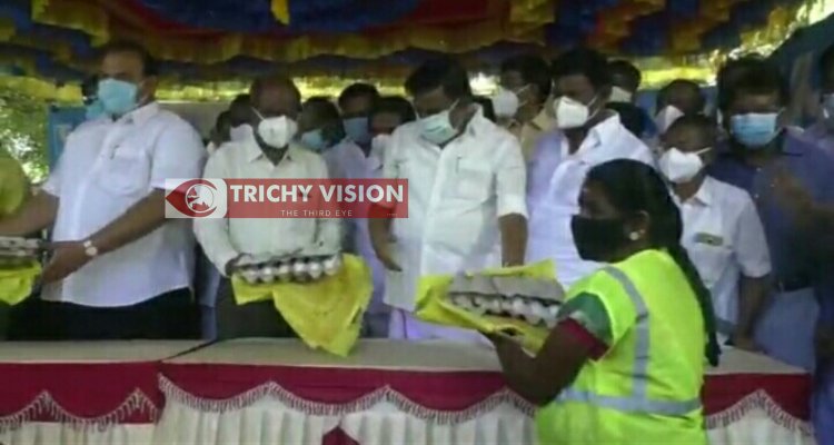திருச்சி மாநகராட்சியில் பணியாற்றும் துப்புரவு பணியாளர்களுக்கு நாமக்கல் மாவட்டம் முட்டை வியாபாரிகள் சங்கம் சார்பில் வழங்கப்பட்ட 3000 பேருக்கு முட்டை வழங்கும் நிகழ்ச்சி மாநகராட்சி அலுவலகத்தில் நடைபெற்றது. இதில் 30 முட்டைகள் அடங்கிய ஒரு அட்டையை துப்புரவு பணியாளர்களுக்கு நகர்ப்புற வளர்ச்சித் துறை அமைச்சர் கே.என் நேரு வழங்கினார்.