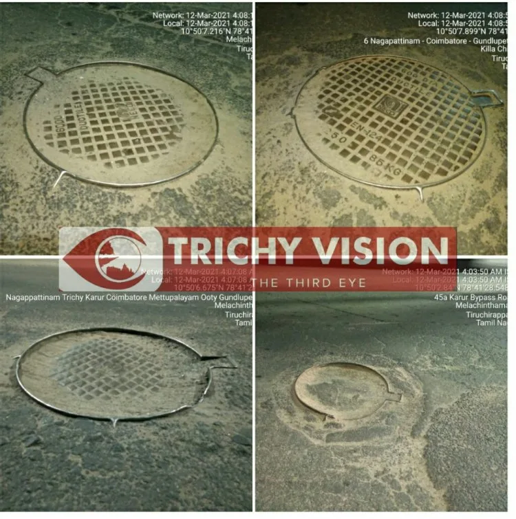 திருச்சி சத்திரம் பேருந்து நிலையத்தில் இருந்து கரூர் செல்லக்கூடிய நெடுஞ்சாலையில் எப்போதும் பரபரப்பாகவே காணப்படும். இந்த நிலையில் ஏற்கெனவே சாலைகள் குண்டும் குழியுமாக காட்சி அளிக்கிறது. இந்நிலையில் இந்த சாலையின் நடுவே பாதாள சாக்கடை மூடிகள் உள்ளன. இந்த 7 பாதாள சாக்கடை மூடிகள் சாலையின் மேற்பகுதியில் வேகத்தடை போன்று உள்ளது.