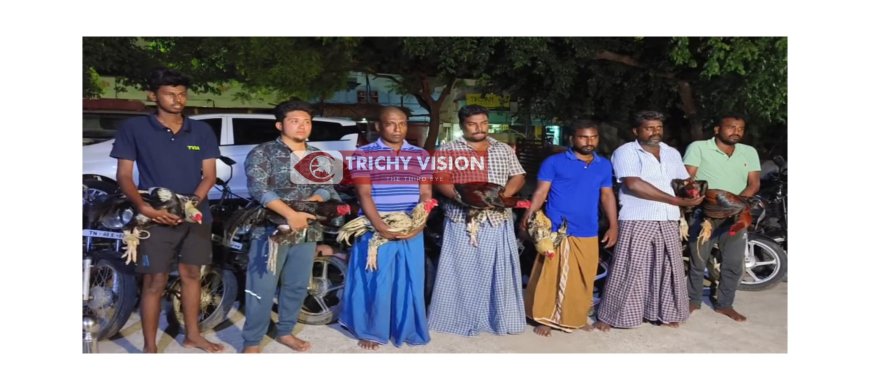 சினிமா பட பாணியில் ஆங்காங்கு ஒவ்வொரு இடமாக நுழைந்து ரகசியமாக சோதனையிட்டனர். அப்போது இருங்களூரில் உள்ள தனியார் (SRM) மருத்துவமனையிக்கு பின்புறம் உள்ள தோப்பில் சேவல் சண்டை நடத்தி சூதாட்டத்தில் சிலர் ஈடுப்பட்டு இருந்தனர். இதையடுத்து போலீசாரை பார்த்ததும், அங்கிருந்தவர்கள் தப்பி ஓட முயற்சித்தனர். அவர்களை போலீசார் மடக்கி பிடித்த போது, வாக்குவாதத்தில் ஈடுபட்டனர். பின்னர் 7 பேரை பிடித்து சமயபுரம் காவல் நிலையத்துக்கு அழைத்து சென்று விசாரித்தனர். இந்த விசாரணையில் இருங்களூர் பகுதியை சேர்ந்த அனீஸ் அஹமத் (23), கணேசமூர்த்தி (38), சுரேஷ் (44), பூபதி (34), ஜான் நெப்போலியன் (45) , அஜித் (25) மற்றும் சிறுவர் உட்பட 7 பேரை போலீசார் கைது செய்தனர்.
