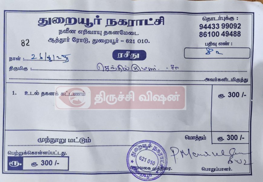 குறிப்பாக நான்கு சுடுகாட்டில் ஆத்தூர் சாலையில் உள்ள மின்மயானத்தில் மட்டும் நகராட்சி சார்பாக பணம் வசூலிக்கப்பட்டு வருகிறது.இது குறித்து கேட்டால் இந்த ரசீதை கொடுத்தால் தான் இறப்பு சான்றிதழுக்கு பதிவு செய்யப்படும் என தெரிவிக்கிறார்கள்.   கடந்த17ஆம் தேதி நாகலிங்கம் என்பவர் சென்னையில் இறந்து- இவரது உடல், 19ஆம் தேதி துறையூர் ஆத்தூர் சாலையில் உள்ள மயான மேடையில் தகனம் செய்துள்ளனர்.