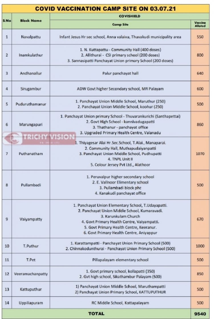 திருச்சி மாவட்டத்தில் நாளை(03.07.2021) கோவிசீல்டு தடுப்பூசி போடப்படும் இடங்களை மாவட்ட ஆட்சியர் சிவராசு அறிவித்துள்ளார்.