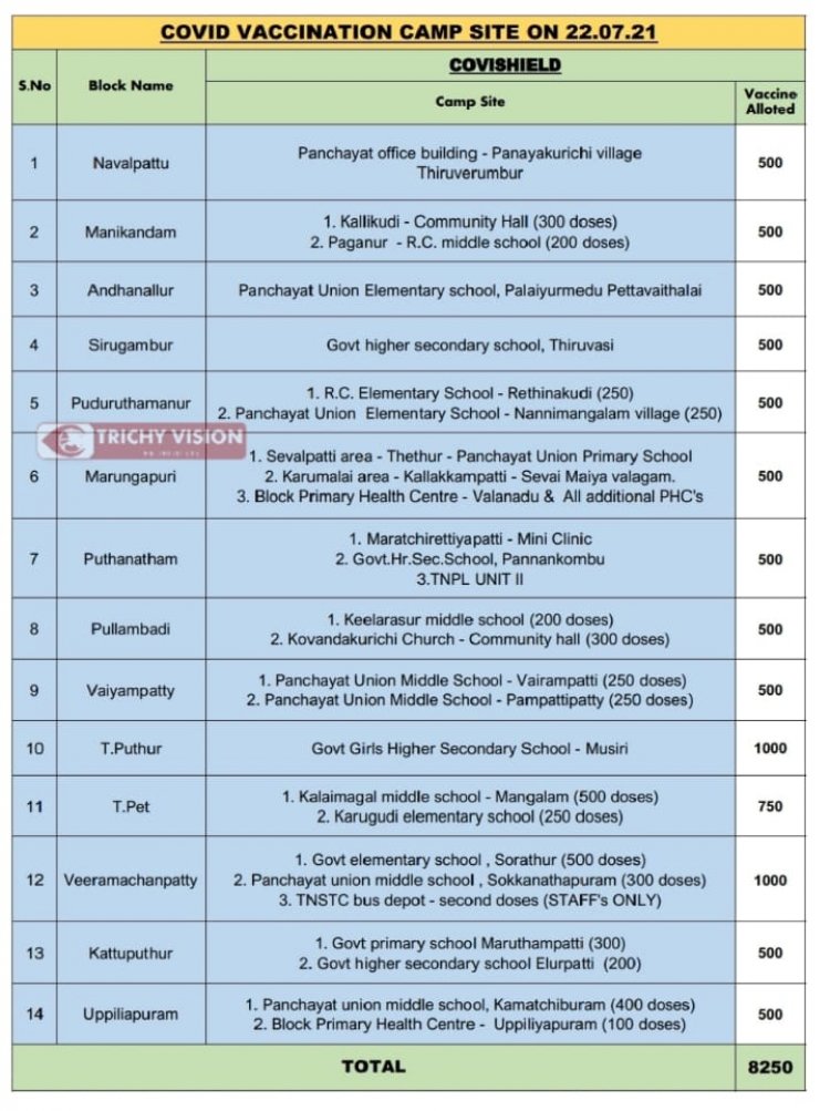திருச்சி மாவட்டத்தில் நாளை(22.07.2021) கோவிசீல்டு தடுப்பூசி போடப்படும் இடங்களை மாவட்ட ஆட்சியர் அறிவித்துள்ளார்.
